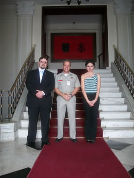 Em frente ao Comando Geral do Corpo de Fuzileiros Navais, Osvaldo Missio, Comandante (CMG-FN) Castilho e Marcia Ferraresi.